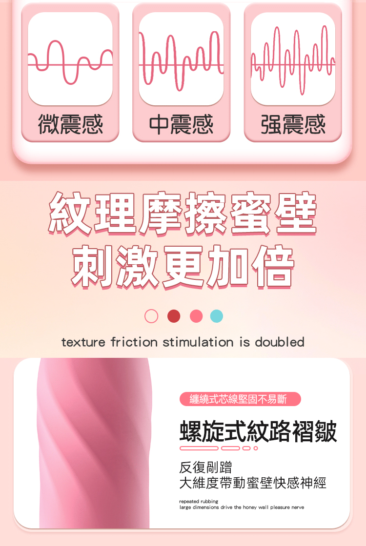 - 表面螺旋式紋路與褶皺設計,每次接觸都帶來強烈的摩擦刺激,反覆剮蹭敏感部位,深層挑逗蜜壁快感神經,快速點燃慾望。
