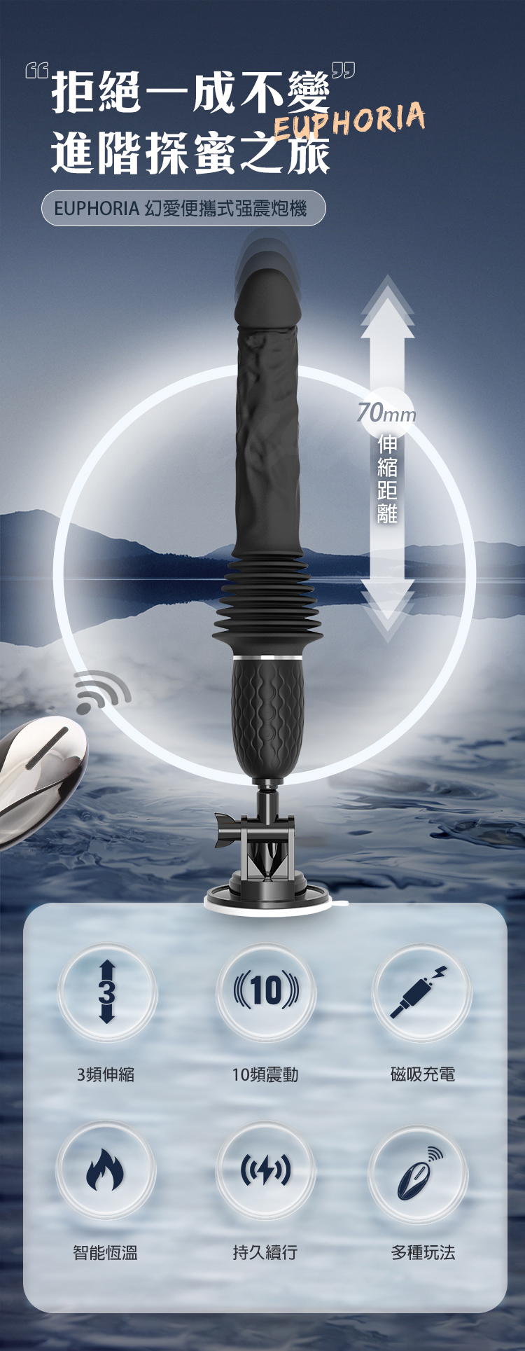 70mm超長伸縮行程,每一次深入都直搗慾望核心。搭載強勁馬達動力引擎,不卡頓、不停擺,讓你在愛的衝刺中無後顧之憂。專為G點設計的激震衝擊,次次精準命中,高潮來得毫不費力!