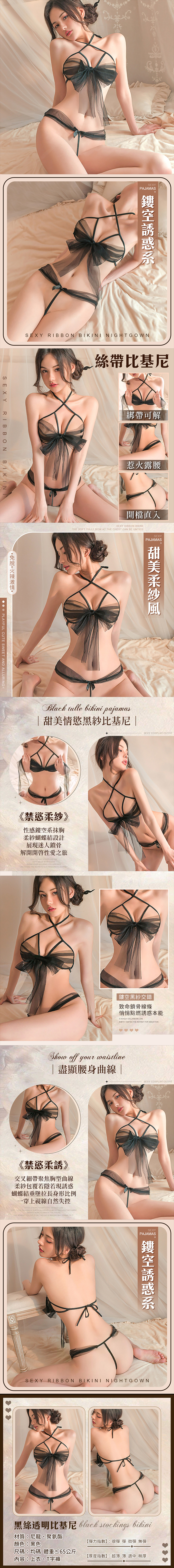 低調黑紗,釋放致命魅力 鏤空抹胸設計搭配柔紗蝴蝶結,展現迷人鎖骨曲線,透視剪裁若隱若現,悄悄點燃誘惑本能。
